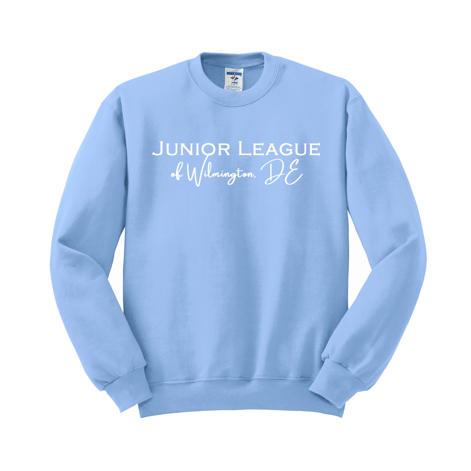 Junior League of Wilmington Script Crewneck Sweatshirt printed with the logo across the front. Cozy up in this classic crewneck sweatshirt. Our ultra-soft Junior League NuBlend fleece will be your new favorite! All custom league items are nonreturnable/nonrefundable.