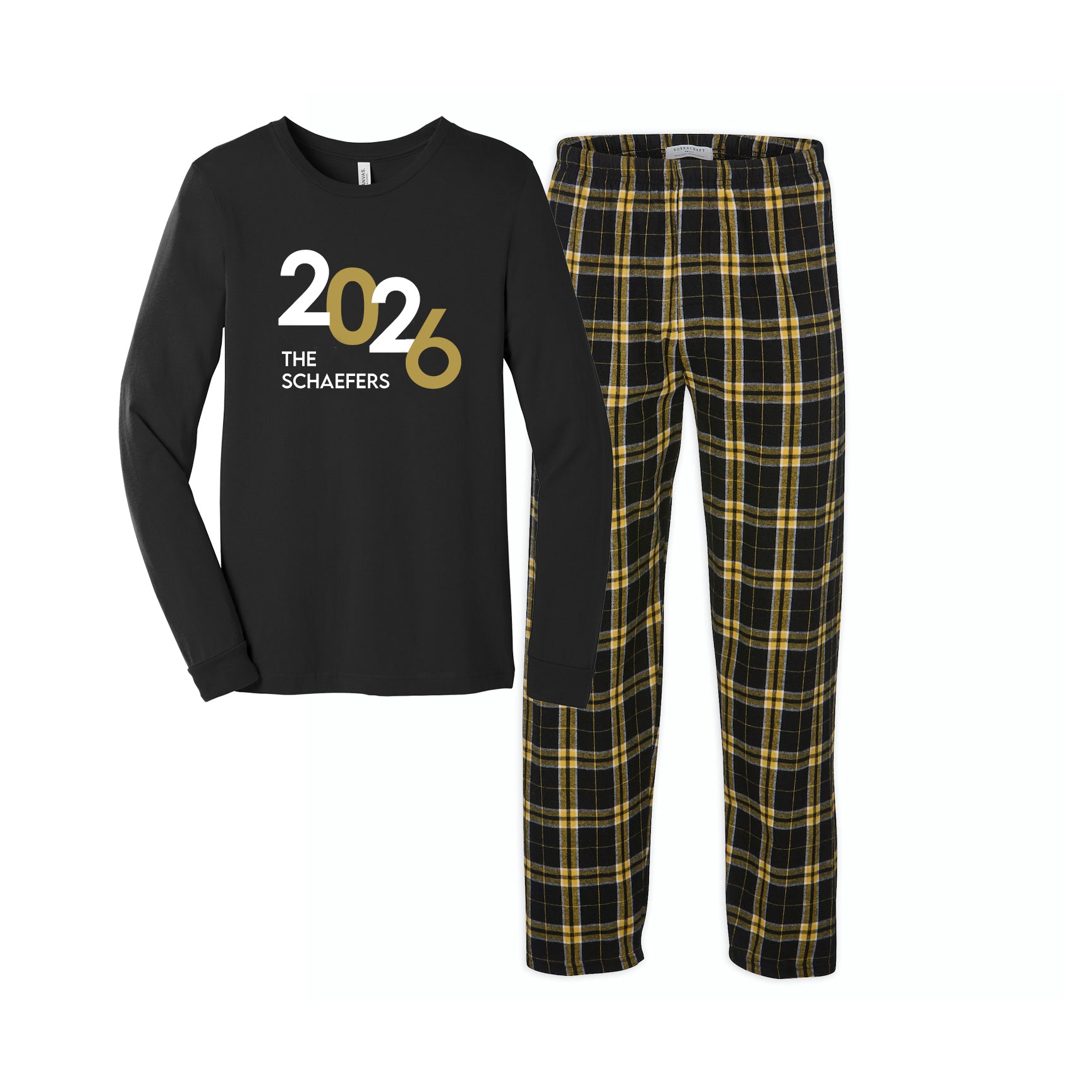 Our cozy countdown pajamas are just what you need to bring in the new year! These pajamas are perfect for the winter months and lounging around all year long. Set includes a black ultra soft long sleeve t-shirt with 2025 logo and matching black and gold flannel pants. Personalized with your family name at no additional charge. Flannel pants come with black drawcord elastic waist and side pockets.