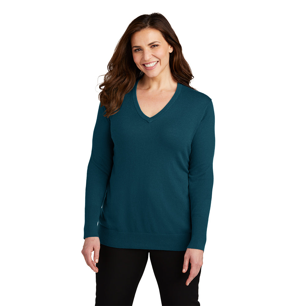 A beautiful and versatile addition to any work wardrobe, our fine-gauge v-neck sweater has fully-fashioned sleeves for strength, comfort and longer wear.  Beautifully embroidered with the Junior League Icon on the left chest.